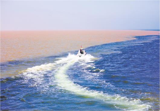 7月24日,中國漁政執法船37181穿過黃河入海分界線在康華海洋牧場附近巡邏。今年以來,東營市墾利區漁政漁港監督監察大隊利用執法船艇出動執法人員300余人次、巡航1000余海里,嚴格落實海洋伏季休漁制度,忠誠守護藍色國土和漁業資源。