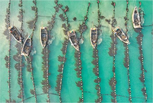 11月1日,榮成愛倫灣海洋牧場,漁民正駕駛漁船收獲牡蠣。連日來,在榮成市各大海洋牧場,漁民正加緊進行水產品收獲作業,海上一派繁忙景象。