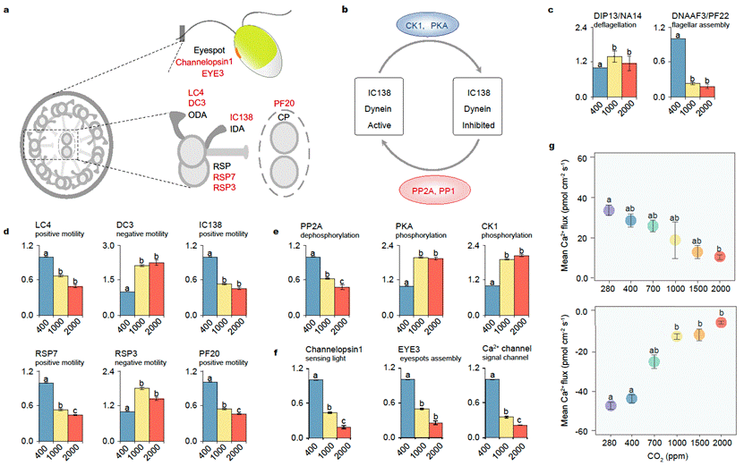 研究團隊建立了不同CO2梯度(280、400、700、1000、1500、2000ppm)的室內微藻長期純化培養體系及野外中試實驗平臺,設計并制作了微藻運動監測計數裝置,通過對極地冰藻(Microglena sp.)、廣鹽性鹽藻(Dunaliella salina)和淡水萊茵衣藻(Chlamydomonas reinhardtii)長達6年的室內傳代培養及野外中尺度實驗發現,水體酸化條件下三種微藻的運動速率和再生能力顯著降低。長期酸化條件下,Microglena sp.與鞭毛運動能力調控正相關的輪輻蛋白、鈣離子通道蛋白和動力蛋白基因表達下調;磷酸化調節途徑中負相關的蛋白磷酸酶2A和蛋白磷酸酶1基因表達上調,正相關的酪蛋白激酶1與蛋白激酶A基因表達下調。在鈣信號調節和磷酸化調節兩條途徑的交互作用下,Microglena sp.的運動能力顯著降低。