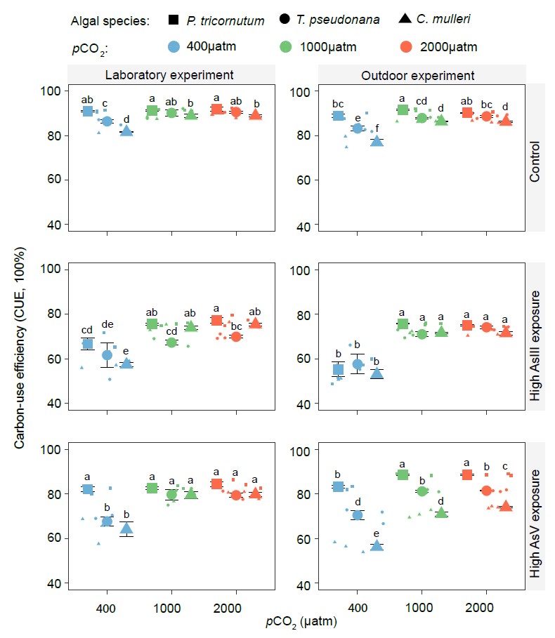 圖2. 海水酸化和砷脅迫對硅藻碳利用效率的影響