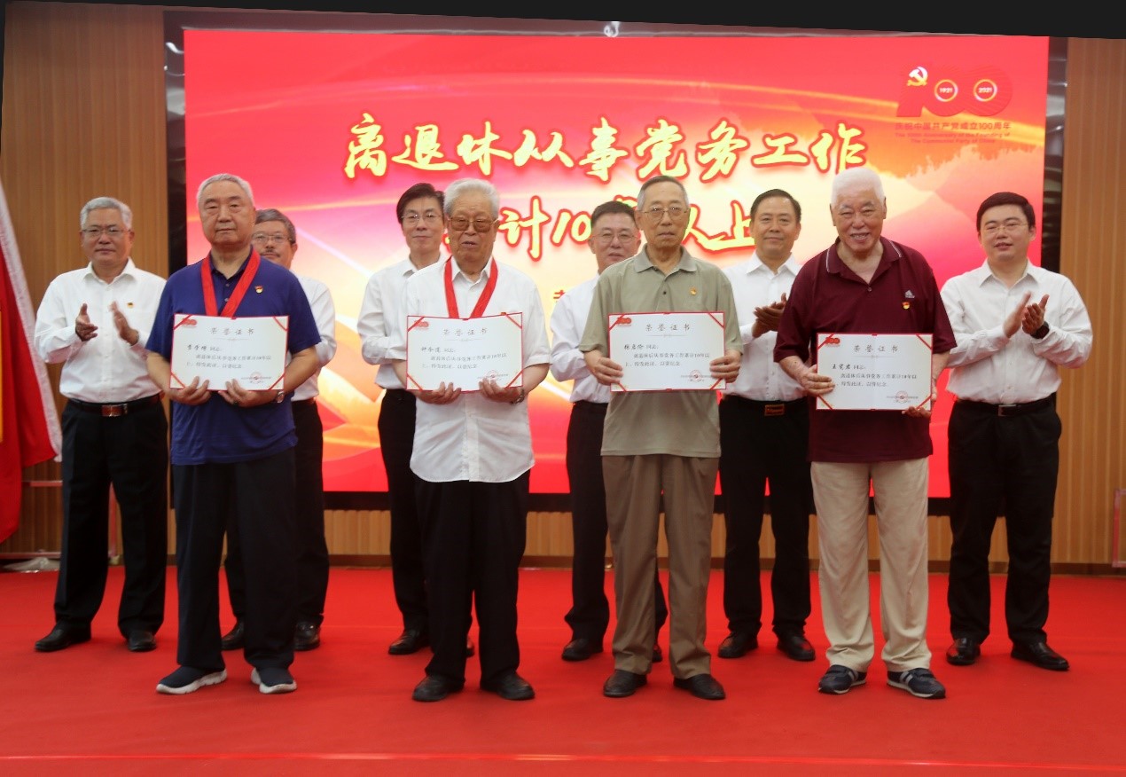 會(huì)議宣讀了《關(guān)于為離退休后從事黨務(wù)工作10年以上人員頒發(fā)榮譽(yù)證書(shū)的通報(bào)》,我所鐘令道、李學(xué)增、張啟倫、王憲君、黃允祥和張世澤等6位同志榜上有名。4名離退休后從事黨務(wù)工作老黨員代表現(xiàn)場(chǎng)獲頒榮譽(yù)證書(shū)。