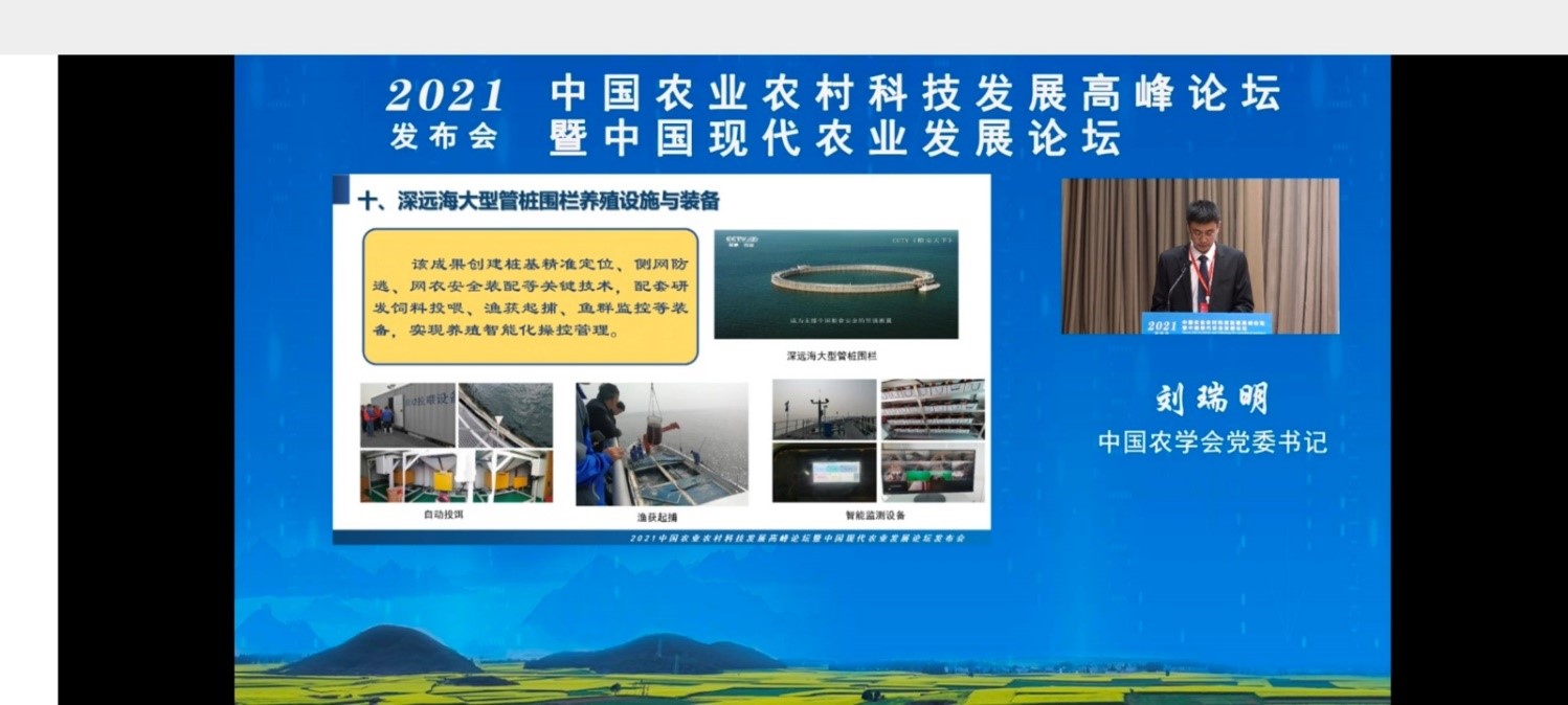 11月19日,2021中國農(nóng)業(yè)農(nóng)村科技發(fā)展高峰論壇暨中國現(xiàn)代農(nóng)業(yè)發(fā)展論壇發(fā)布會在北京舉行。大會發(fā)布了《2021中國農(nóng)業(yè)農(nóng)村重大新技術(shù)新產(chǎn)品新裝備》遴選結(jié)果,來自全國農(nóng)業(yè)領(lǐng)域的10項(xiàng)新技術(shù)、11項(xiàng)新產(chǎn)品和10項(xiàng)新裝備入選,其中,中國水產(chǎn)科學(xué)研究院黃海水產(chǎn)研究所關(guān)長濤研究員主持研發(fā)的“深遠(yuǎn)海大型管樁圍欄養(yǎng)殖設(shè)施與裝備”入選“中國農(nóng)業(yè)農(nóng)村重大新裝備”。