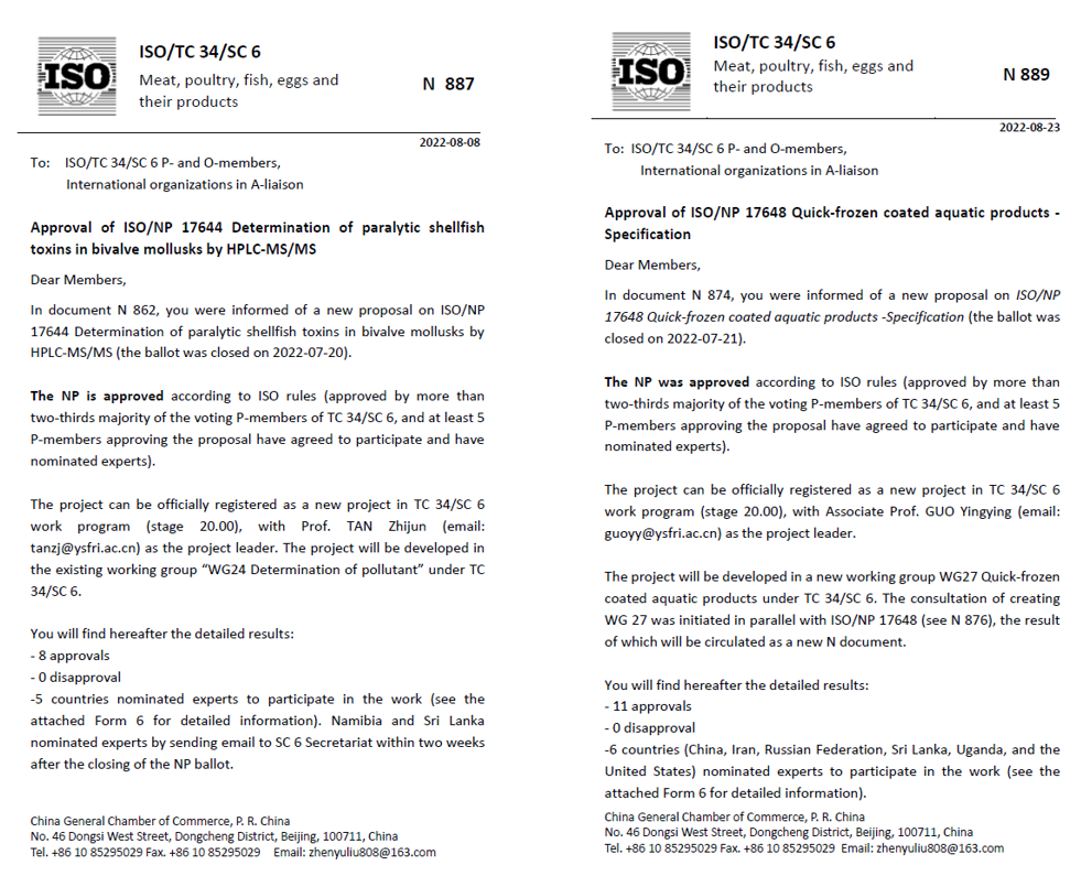 8月8日,由中國水產科學研究院黃海水產研究所主導申報的2項ISO國際標準項目提案ISO/NP 17644《雙殼貝類中麻痹性貝類毒素(PSTs)的測定 液相色譜-串聯質譜法(Determination of paralytic shellfish toxins in bivalve mollusks by HPLC-MS/MS)》和ISO/NP 17648《速凍裹衣水產制品(Quick-frozen coated aquatic products—Specification)》,經過ISO/TC34/SC6秘書處組織的為期2個多月新項目提案(NP)投票正式獲批立項,目前進入工作組草案(WD)階段。兩項標準分別由譚志軍研究員和郭瑩瑩副研究員牽頭制定。