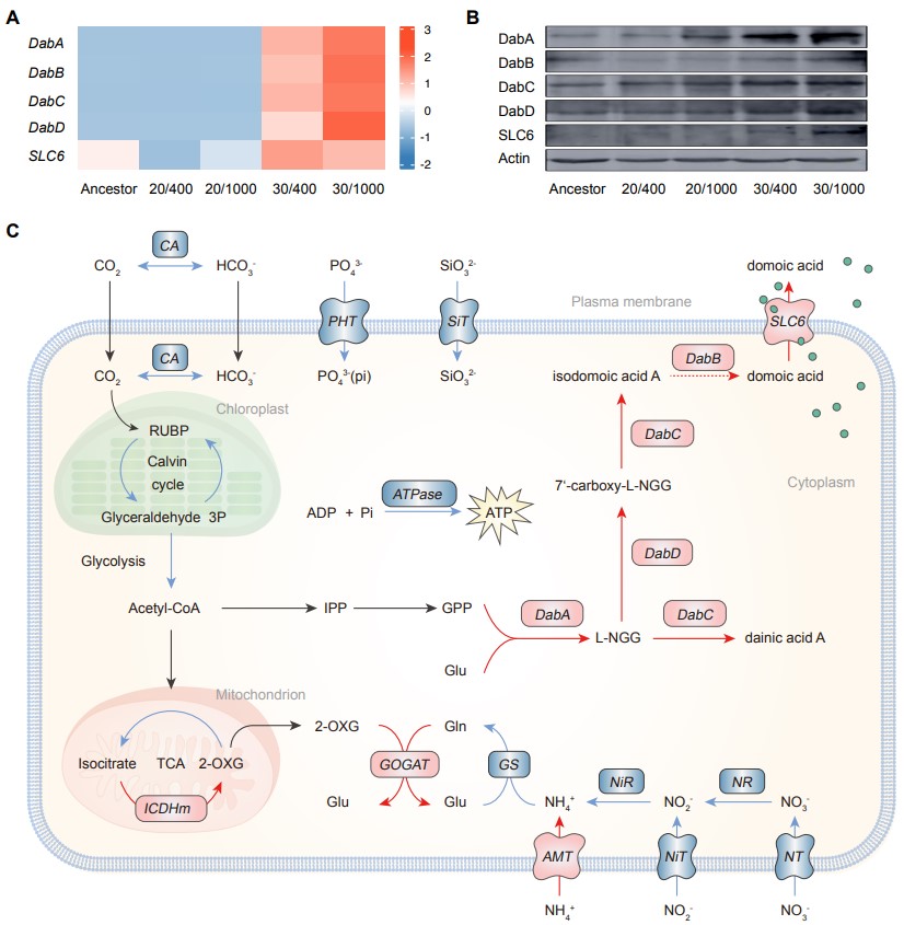 圖3. 長期升溫和酸化下多列擬菱形藻軟骨藻酸代謝調控機制