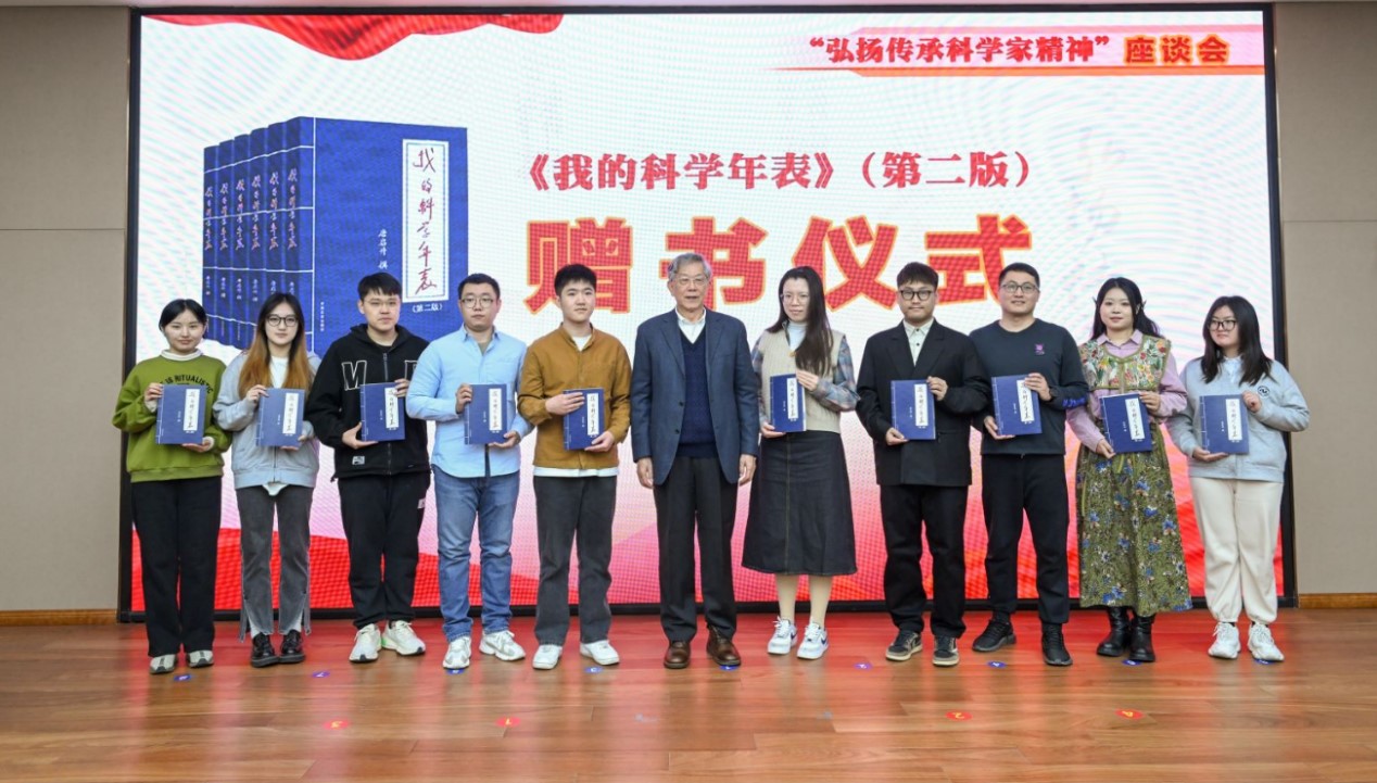 唐院士為黃海水產研究所博士后、研究生代表贈送親筆簽名的《我的科學年表》(第二版),希望新一代漁業科技工作者切實增強漁業科技自立自強的使命感、責任感、緊迫感、榮譽感,以時不我待、只爭朝夕的精神,為漁業強國建設做出新的更大貢獻。