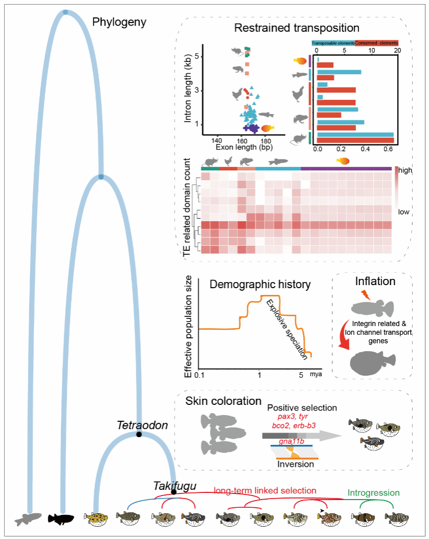 為突破這些局限,本研究整合10種東方鲀染色體級基因組、表觀基因組、群體重測序及轉錄組數據,構建了迄今最穩健的系統發育框架,揭示其網狀進化模式,并表明轉座元件收縮塑造了基因組小型化,而染色體倒位與色素基因的正選擇共同驅動爆發式物種形成,從而為理解基因組演化與表型創新的耦合提供了新范式。