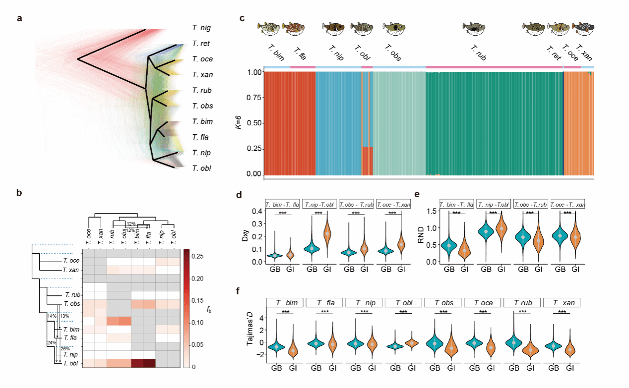 在明確基因組小型化機制的基礎上,研究進一步探討了東方鲀屬的整體演化動態。通過單拷貝基因、非編碼保守元件及極端保守元件等多種分子證據,構建了東方鲀屬的系統發育框架,證實其演化關系呈現典型的網狀結構,而非傳統二分式樹形拓撲。群體遺傳學分析進一步揭示,9種東方鲀群體的遺傳背景僅聚為6個離散譜系,除暗紋東方鲀與紅鰭東方鲀外,其余姊妹支遺傳分化極小。綜合群體遺傳中FST、π、Dxy及RND等參數分析表明,橫紋東方鲀與星點東方鲀的分化過程受基因滲入主導,廣泛的基因流導致系統發育信號混雜;而其余姊妹支表現出顯著的連鎖選擇信號,適應性位點的持續清掃推動了形態分化。Tajima’s D等指標在分化區域與其他基因組背景區域的顯著差異,進一步支持這些區域經歷了長期正選擇。這表明東方鲀屬的輻射演化是由“基因滲入-連鎖選擇”動態平衡驅動的網狀過程,該遞進分析不僅連接了基因組結構與演化歷史的橋梁,還為揭示具體表型分化機制提供了演化框架。