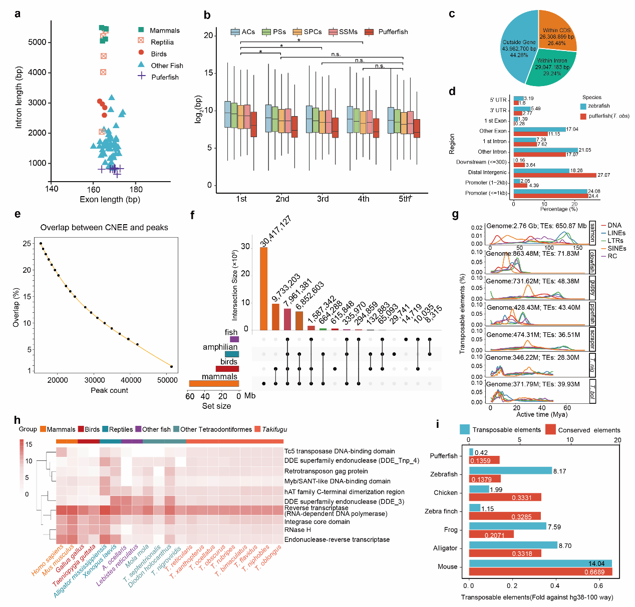 研究團隊通過74種脊椎動物比較基因組學分析發現,河鲀基因組內含子長度為脊椎動物中最短,而外顯子長度與其他物種無顯著差異。進一步分析顯示,河鲀基因組的保守元件數量與其他魚類相當,但轉座元件顯著收縮。對轉座元件相關功能域的統計表明,河鲀中轉座元件相關酶的結構域數量顯著少于其他物種,提示轉座元件關鍵酶的收縮是河鲀基因組小型化的主要驅動因素。這一基礎發現揭示了基因組小型化如何為后續快速演化提供結構約束,為理解河鲀輻射進化的遺傳背景奠定了基礎。