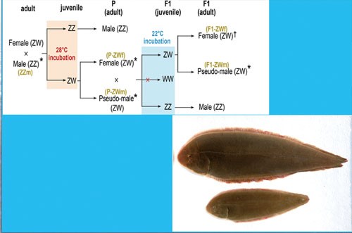 2. The sex specific SSR of half-smooth tongue sole has been selected and the technology of identifying the ZZ male, ZW female and WW super female has also been invented; There are 11 sex related genes that were cloned and characterized, for example dmrt1; dmrt1 is proved to be Z chromosome-linked and the key gene for testis development; The reason for low female ratio of tongue sole is uncovered and the technology of high female offspring production (increased by 20%) has been invented to solve this problem.