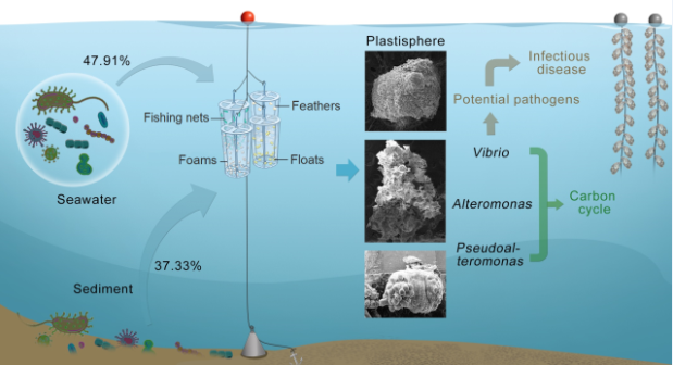 近來,漁業(yè)環(huán)境污染生態(tài)學(xué)團(tuán)隊(duì)在微塑料與污染物的復(fù)合效應(yīng)、微塑料對病原微生物的載體作用以及微塑料的來源解析等方面開展深入研究,取得一系列創(chuàng)新成果:①發(fā)現(xiàn)聚苯乙烯微塑料對十溴聯(lián)苯醚(簡稱BDE-209,是一種高效廣譜添加型阻燃劑,廣泛應(yīng)用于橡膠、塑料、纖維等材料)具有載體和清除的雙重作用,但總體而言,微塑料的載體作用超過其清除作用,因此微塑料增強(qiáng)了貝類對BDE-209的富集;②通過自主研發(fā)的微塑料原位觀測裝置,首次報(bào)道了實(shí)驗(yàn)采樣點(diǎn)的淺海養(yǎng)殖區(qū)微塑料表面細(xì)菌生物膜的形成過程,發(fā)現(xiàn)夏季微塑料表面附著大量弧菌(包含潛在病原性弧菌),并初步證實(shí)天然有機(jī)質(zhì)是影響微塑料表面潛在病原性弧菌分布的重要因素;③估算出實(shí)驗(yàn)采樣點(diǎn)的淺海養(yǎng)殖區(qū)塑料養(yǎng)殖設(shè)施對沉積物中微塑料的貢獻(xiàn)率約為57.72%,推算該區(qū)域表層沉積物中微塑料的埋藏量約為183.73t。以上研究成果為科學(xué)評估微塑料對海洋漁業(yè)生態(tài)系統(tǒng)的影響提供了重要支撐。