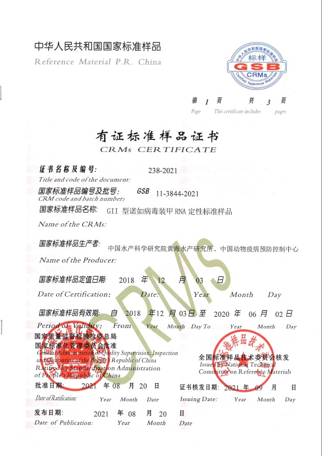 近日,國家市場監督管理總局、國家標準化管理委員會聯合發布國家標準公告(2021年第10號)。中國水產科學研究院黃海水產研究所水產品質量與安全研究室姚琳副研究員牽頭創制的“GII型諾如病毒裝甲RNA定性標準樣品”(國家標準樣品編號:GSB 11-3844-2021)正式獲得批準、發布。