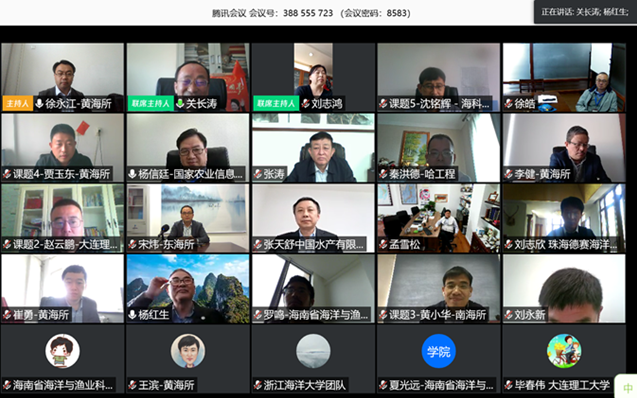 4月24日,由中國水產(chǎn)科學研究院黃海水產(chǎn)研究所牽頭承擔的國家重點研發(fā)計劃“藍色糧倉科技創(chuàng)新”重點專項—“開放海域和遠海島礁養(yǎng)殖智能裝備與增殖模式”(2019YFD0900900)項目啟動會以視頻會議形式召開。啟動會開幕式由黃海水產(chǎn)研究所所長金顯仕研究員主持。科技部中國農村技術開發(fā)中心專項管理團隊、農業(yè)農村部漁業(yè)漁政管理局、山東省科技廳、中國水產(chǎn)科學研究院等單位相關領導,黃海水產(chǎn)研究所、大連理工大學、中國水產(chǎn)科學研究院東海水產(chǎn)研究所、中國水產(chǎn)科學研究院南海水產(chǎn)研究所、海南省海洋與漁業(yè)科學院、浙江海洋大學和萊州明波水產(chǎn)有限公司等項目參與單位共40余人參加了本次啟動會。