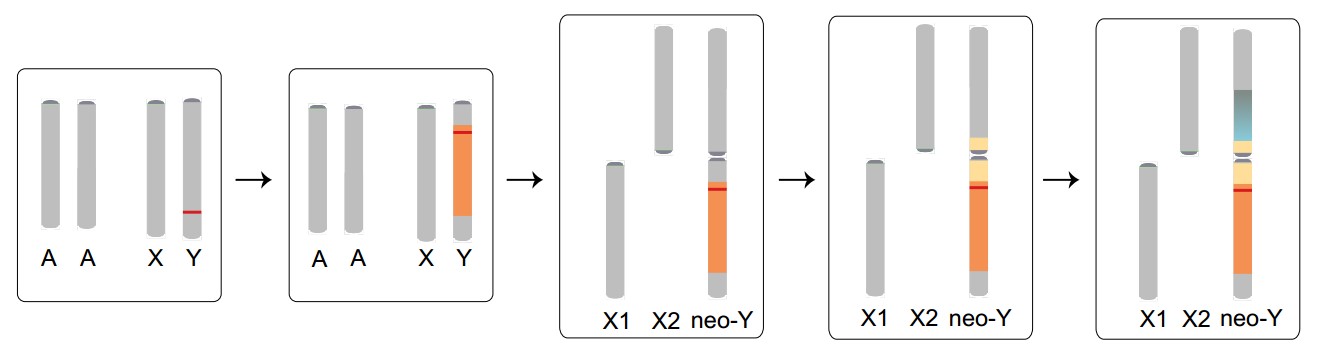 斑石鯛是我國新興的重要海水養殖魚類,其味道鮮美,市場價值很高,深受消費者歡迎。斑石鯛具有復性染色體特征,其雌魚具有22對常染色體和 X1X1X2X2性染色體,而雄魚則具有22對常染色體和X1X2 Y性染色體,是研究魚類性染色體起源與進化的理想材料。該聯合研究團隊結合BGI-500、Nanopore、PacBio和Hi-C等技術,率先完成斑石鯛雌魚和雄魚染色體水平基因組精細圖譜繪制。利用三代和重測序數據獲得單倍型信息,將斑石鯛Y染色體非同源重組區進行精確組裝。結構分析表明Y染色體上存在一個約23.5 Mb的倒位,推測其在性別決定基因的產生和性染色體的進化過程中發揮重要作用。該研究推演了新Y(neo-Y)性染色體的起源與進化軌跡。進化分析表明,Y染色體上新融合進來的部分在融合后才產生重組抑制,推斷neo-Y的形成是原始的Y染色體與一條常染色體融合而來。同時該研究揭示了精巢和卵巢發育過程中性染色體基因的時空表達特征,鑒定了性染色體上性腺發育相關重要基因。斑石鯛neo-Y和X染色體的高質量組裝,為理解復性染色體魚類性別決定機制和性染色的進化提供了寶貴的遺傳資源。