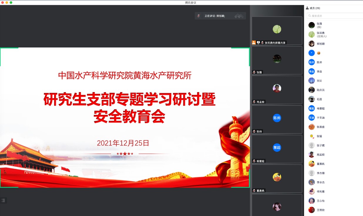 12月25日,中國水產科學研究院黃海水產研究所研究生黨支部召開專題學習研討暨安全教育會,會議由支部書記周孟姣主持,支部全體黨員通過線上方式參加了會議。