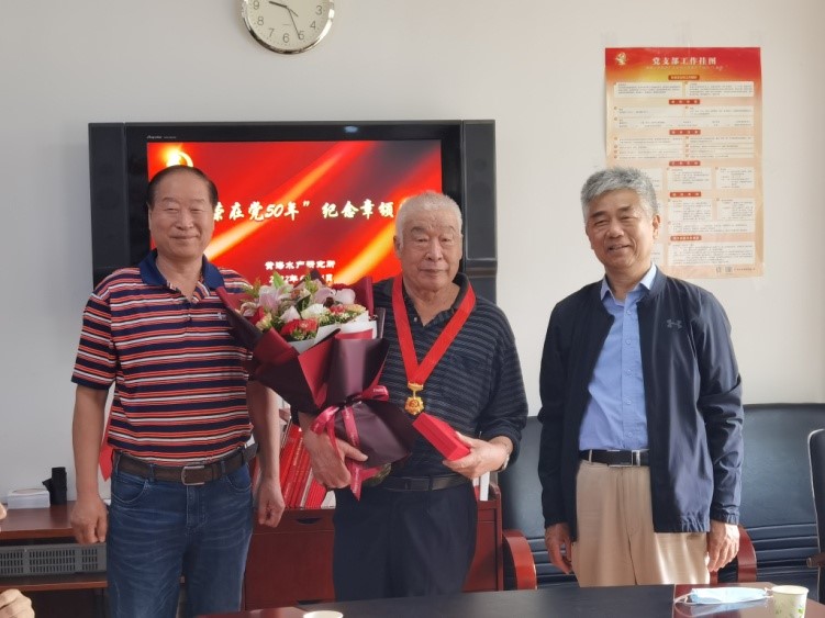 會議舉行了莊重簡樸的“光榮在黨50年”紀念章頒發儀式。黃海水產研究所原所長、首批“光榮在黨50年”紀念章獲得者、離退休一支部書記王清印及退休二支部書記燕敬平一起為老黨員呂明寶同志頒發了“光榮在黨50年”紀念章,并送上了學習資料和鮮花。作為慶祝“七一”活動的重要組織部分,該紀念章頒發儀式隆重莊嚴,更加激發了老黨員牢記初心使命、永遠跟黨走的信心和決心。