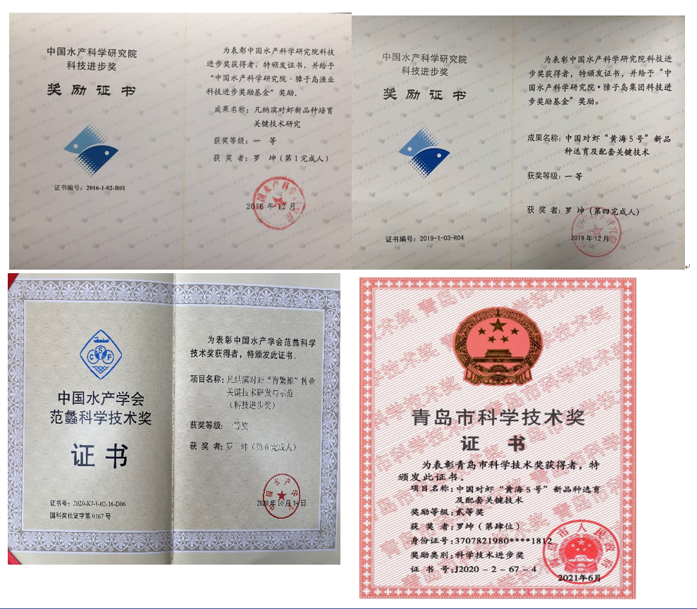 羅坤副研究員主要從事水產動物遺傳育種和健康養殖研究。作為核心力量研發并建立了水產多性狀復合育種技術體系,先后開展了中國對蝦、羅氏沼蝦、凡納濱對蝦和俄羅斯鱘的遺傳選育、工藝技術體系的研究。主持國家及省市級科研項目15項,發表論文90余篇、參編專著2部,獲國家發明專利13項、行業標準1項、地方標準6項,參與選育國家級新品種4個。獲省部級一等獎3次、國家海洋局海洋創新成果一等獎1次、中國水產科學研究院科技進步一等獎2次、中國水產學會范蠡科學技術獎科技進步一等獎1次、中國產學研合作創新成果二等獎1次、青島市科技進步二等獎1次。