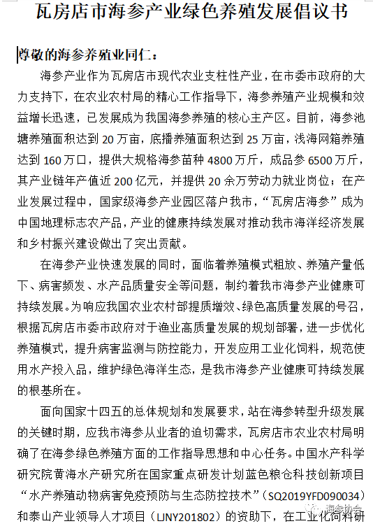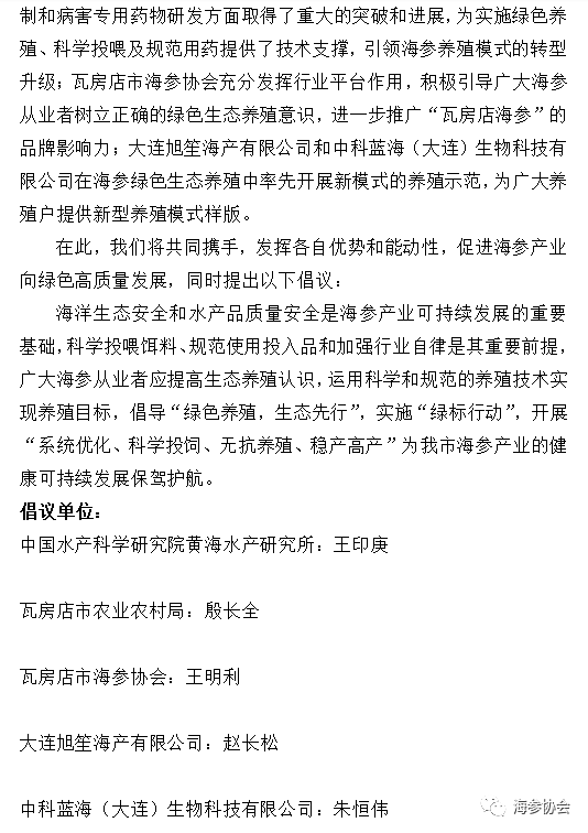 2月28日,由中國水產(chǎn)科學研究所、瓦房店市農業(yè)農村局、瓦房店市海參協(xié)會、大連旭笙海產(chǎn)有限公司、中科藍海(大連)生物科技有限公司等多家涉海養(yǎng)殖單位,在位于遼刺參主產(chǎn)區(qū)的瓦房店市謝屯鎮(zhèn)沙山村的旭笙海產(chǎn)公司共同發(fā)起倡議,實施中國水產(chǎn)科學研究院黃海水產(chǎn)研究所重點研發(fā)“藍色糧倉”科技創(chuàng)新項目“水產(chǎn)養(yǎng)殖動物病害免疫預防與生態(tài)防控技術”(sq2019yfd090034)和泰山產(chǎn)業(yè)領導人才項目(LjNY201802)下的工業(yè)化飼料研制和病害專用藥物研發(fā),以科學投喂和規(guī)范用藥引領傳統(tǒng)海參養(yǎng)殖模式的轉型升級,從海洋生態(tài)安全和水產(chǎn)品質量安全的高度,倡導“綠色養(yǎng)殖,生態(tài)先行”的養(yǎng)殖新模式,以科學手段和技術支撐,促進遼刺參主產(chǎn)區(qū)養(yǎng)殖業(yè)轉型升級,提質增效。