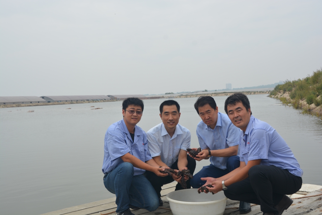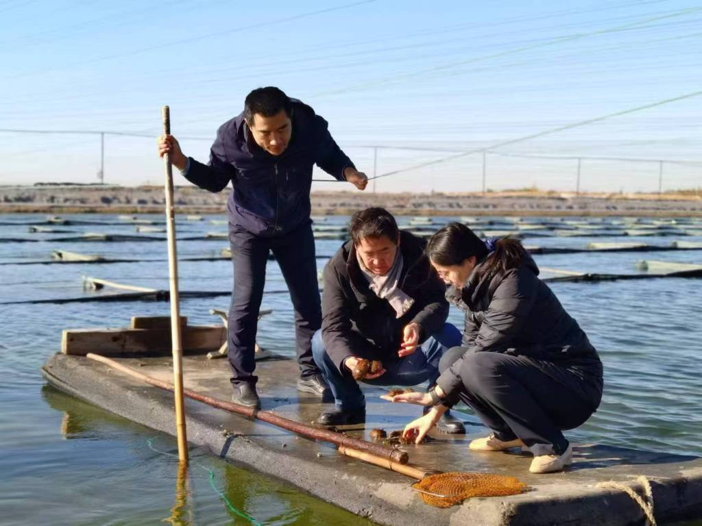 初春時節,王印庚(右二)在東營觀測海參新品種試養情況