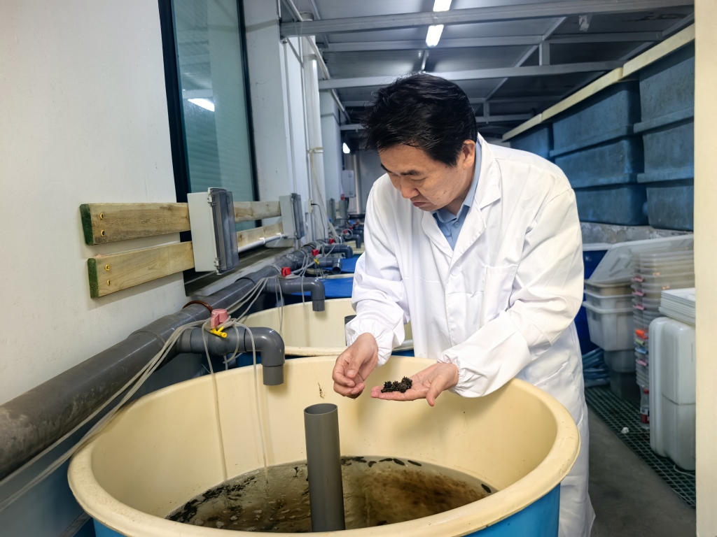6月17日,在黃海所大院水族實驗室里,裝著大小不一的海參養殖水槽次第排開,王印庚正捧著幾頭小拇指大的海參端詳著,這是他帶領團隊耗費16年心力孕育的又一個海參新品種。