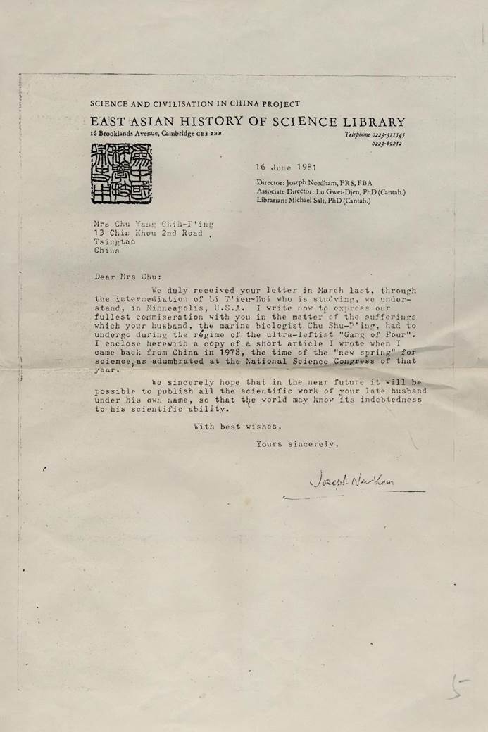 我們于今年3月如期收到您的來信,此信由正在美國明尼阿波利斯學習的李天慧(Li T’ien-Hui)轉寄而來。您的丈夫,海洋生物學家朱樹屏在極左時期遭受了迫害,我謹以此信向您表達深切的憐惜。隨信附上我的一篇短文,這是我在1978年從中國回來后撰寫的,在那一年的全國科學大會上,中國宣告了“科學的春天”。