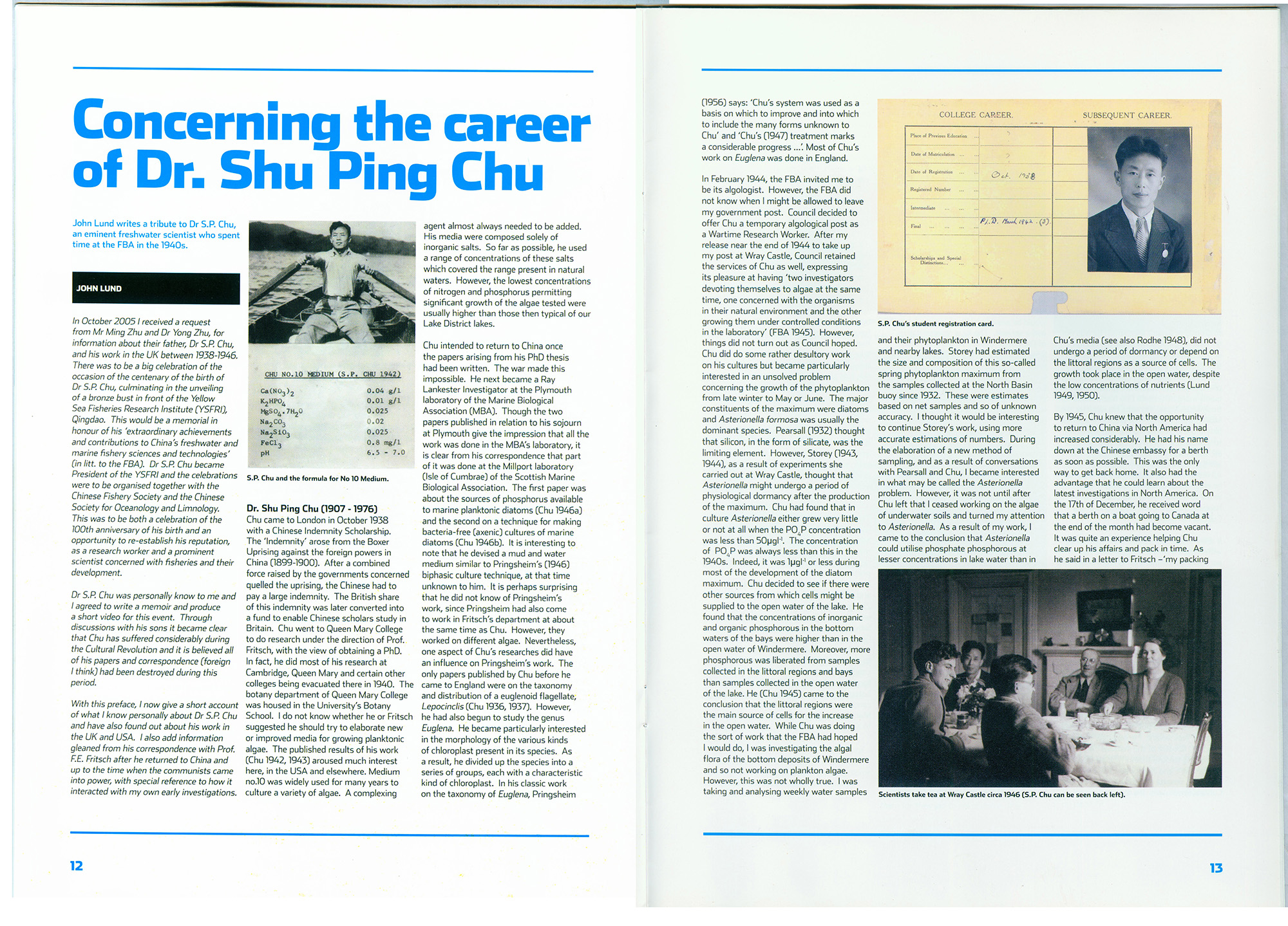 圖片上方為朱樹屏在英國溫德米爾湖中工作,下方為“朱10”配方。此配方照片至今仍展示在英國淡水生物學會的辦公室里。