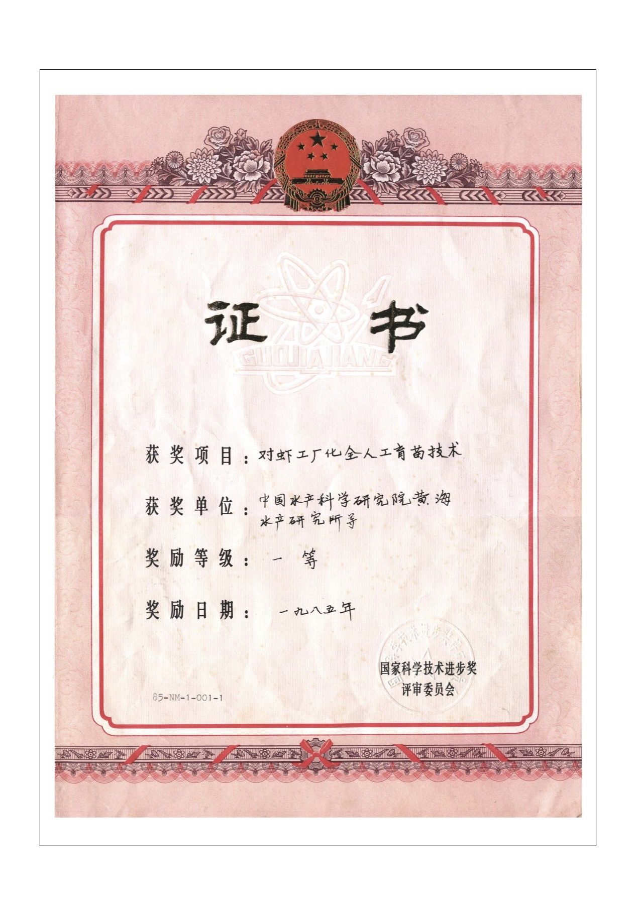 1985-國家科技進步一等獎證書
