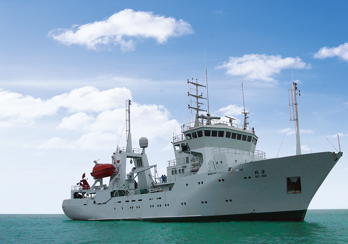 “北斗”號是由挪威政府建造并贈送給中國政府的漁業資源調查船,1984年到達青島港,由中國水產科學研究院黃海水產研究所管理使用。“北斗”號是一艘現代化海洋漁業資源調查船,船長56.4m,總噸位1165,主機一臺2250馬力,輔機兩臺850馬力,定員56人,船上裝有先進的通信導航設備,推進器采用可變螺距,配有前后側推,能在全球冰區以外的海區進行海洋生物資源及其他海洋科學調查。船上設有聲學調查儀器室、水文實驗室、魚類實驗室、海洋化學實驗室、物理海洋實驗室等,主要科研設施包括科研魚探儀系統、CTD、ADCP、底層拖網、變水層拖網、阿氏網、浮游生物拖網和地質采樣設備等。